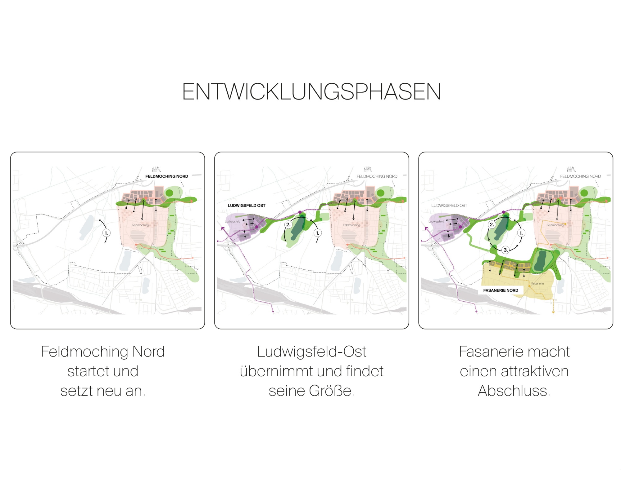 The concept identifies three potential areas for careful urban extension: two urban neighbourhoods adjoining Feldmoching and Ludwigsfeld, and one landscape-oriented neighbourhood north of the Fasanerie. Areas of high landscape value such as Feldmoching North/West, the Obermoos and the Schrederwiesen remain undeveloped. The new neighbourhoods connect sensitively to the existing urban fabric, with open spaces acting as linking elements. A broad range of housing types strengthens social mix and creates long-term perspectives for existing residents. Local supply facilities as well as new social and educational infrastructure complement areas that are currently underserved.