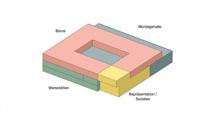 The skeleton construction allows for a combination of large open production areas and flexible office layouts. A comprehensive climate and energy concept in accordance with the KFW 55 standard provides for a geothermal heat exchanger under the building and photovoltaics in combination with a retention roof with an adjoining cistern and pond.