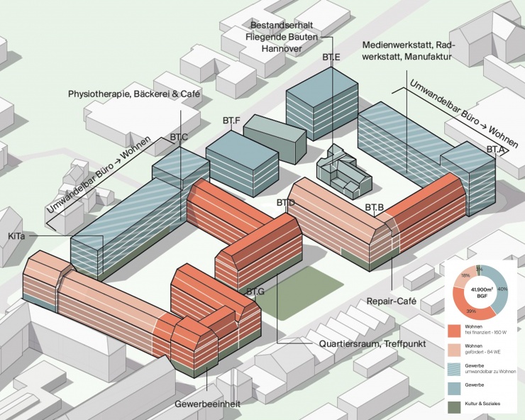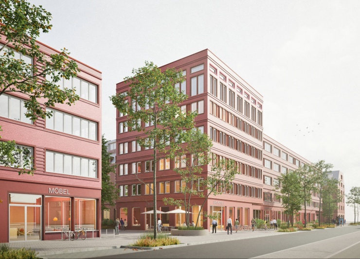 The development vision transforms the former industrial site into an urban, mixed-use neighborhood. The proposal relies on clear spatial edges, strong address formation, and a carefully calibrated relationship between living, working, and public space. Distinctive building corners, a finely tuned grain, and a differentiated height profile create orientation and identity.