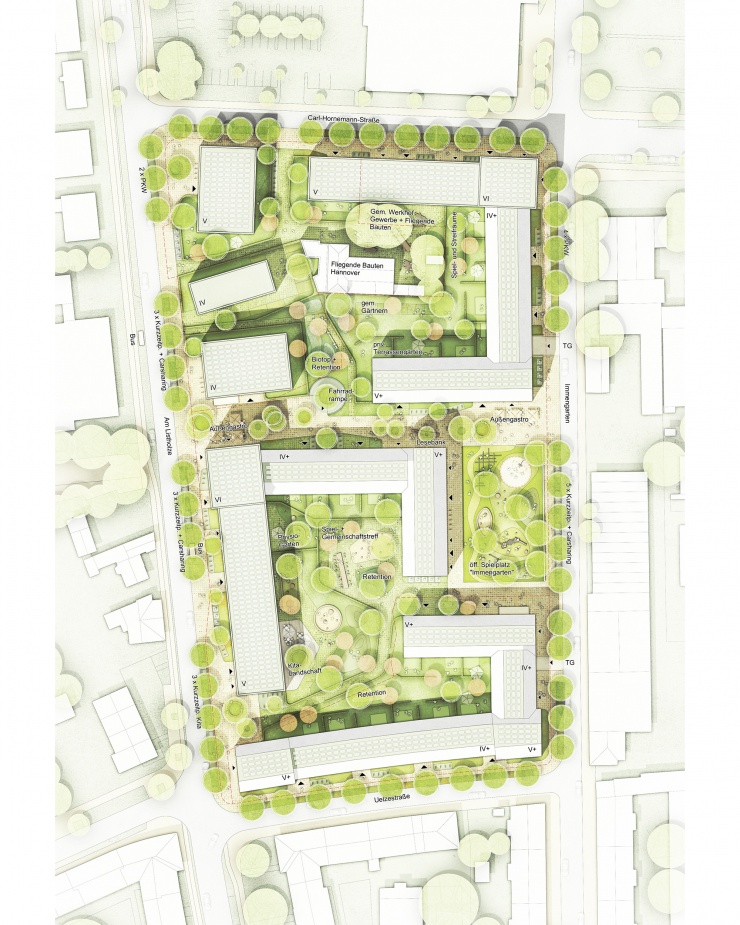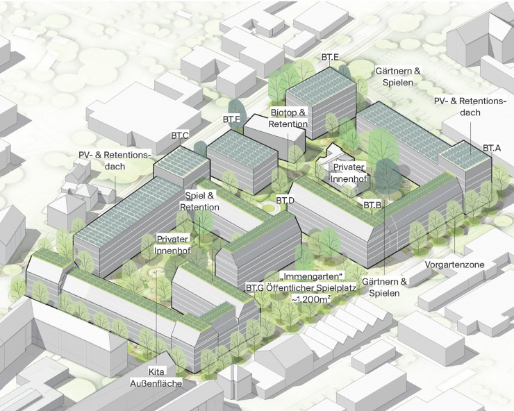 The open space concept focuses on climate resilience, diverse planting, clear places to stay, and the option of a sponge-city approach. Flowering meadows, retention areas, and green facades support biodiversity and a pleasant microclimate.