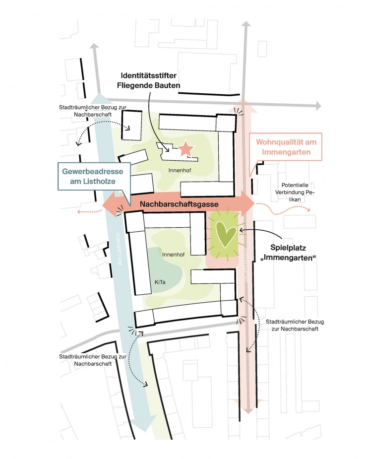 At its center lies a generous public playground that acts as the heart of the neighborhood, framed by active ground-floor uses. A continuous east–west connection strengthens links to the surrounding green corridors and introduces new addresses within the quarter. The courtyard structures draw inspiration from the characteristic Listhöfe, creating protected outdoor spaces for housing, childcare, and community uses.