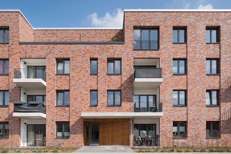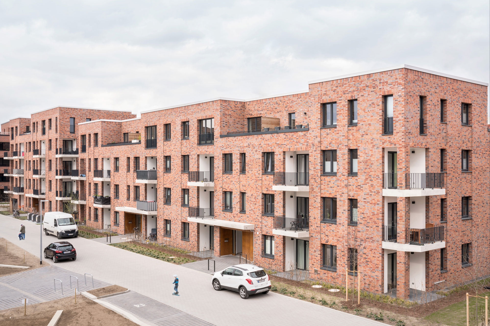 Mit der Entwicklung des Buchholzer Grüns entsteht ein Wohngebiet in attraktiver Lage. Dabei formulieren ein fünf- und ein viergeschossiger Geschosswohnungsbau im Zusammenspiel mit zehn dreigeschossigen Reihenhäusern den nördlichen Auftakt des neuen Quatiers. Die drei Baukörper entwickeln eine kraftvolle eigene Identität, die den urbanen Bezug zu den umliegenden Stadtquartieren und der angrenzenden Podbielskistraße aufnimmt. Die Rhythmisierung in der Höhenentwicklung als auch die Vertikalität durch die übereinander liegenden Fenster und Balkone in den Klinkerfassaden sind zentrale Entwurfsprinzipien. Der Materialwechsel macht den Eingangsbereich deutlich erkennbar und fügt sich gleichzeitig in die Gesamtstruktur der Fassaden ein. Es entsteht eine robuste, unprätentiöse und solide Gestalt. Die Geschosswohnungsbauten bestechen durch einen spannenden Wohnungsmix aus Miet- und Eigentumswohnungen in unterschiedlichen Größen während die Reihenhäuser einen kleinen Gebäudetypus als auch einen großen anbieten und das Parken im Haus ermöglichen.