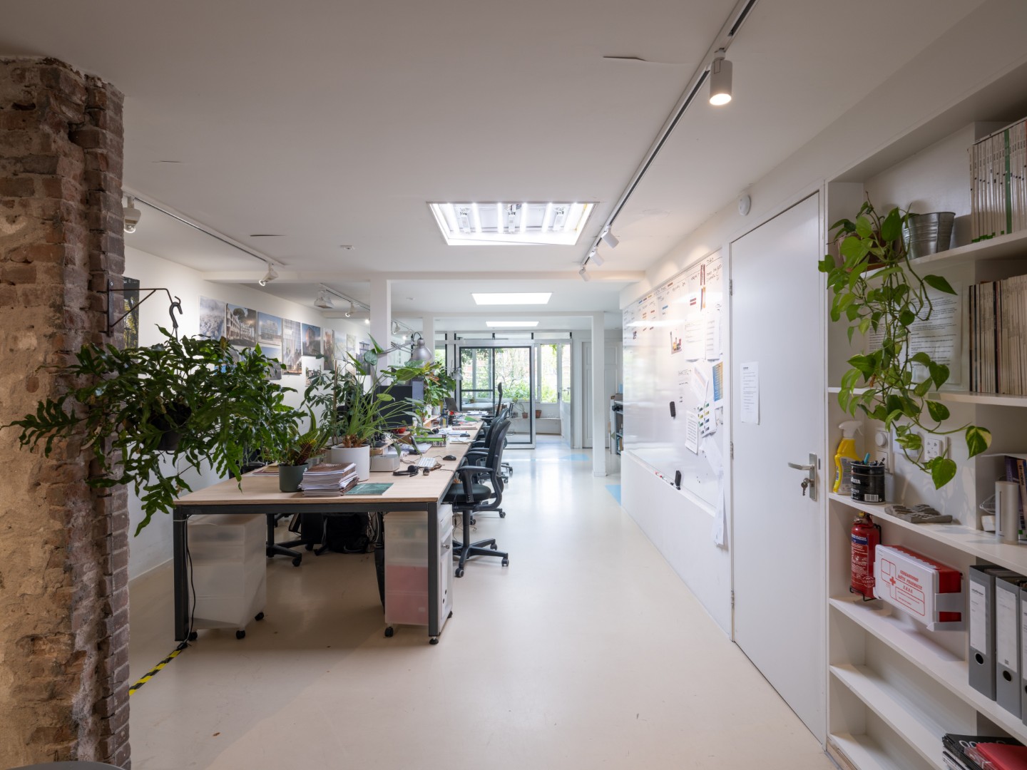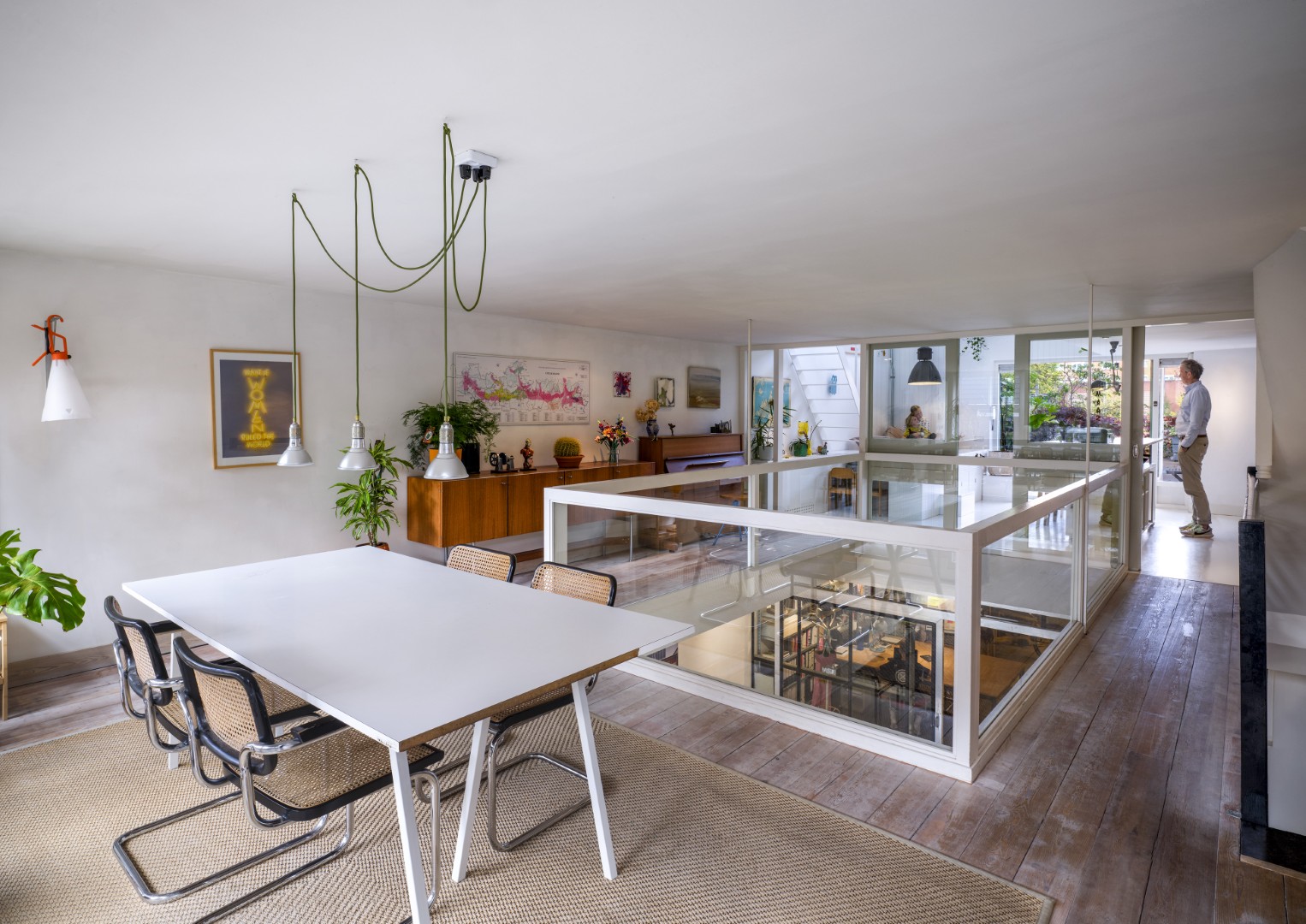 Im Erdgeschoss ist die Vergangenheit des Gebäudes als Arbeitsraum noch deutlich zu erkennen. Es diente einst als privates Büro mit einem Besprechungsraum in einem Flur, der von großen, zur Straße hin gelegenen Fenstern gesäumt ist. Eine Bar – gefertigt aus der halbhohen Wand, die die ehemaligen Galeristen in ihrem Badezimmer verwendet hatten – bildet den Mittelpunkt des Raums. Dahinter, hinter einer Schiebetür, liegt ein ruhigerer Arbeitsbereich mit einer Bibliothek und einem großen Besprechungstisch, der früher Platz für acht Arbeitsplätze bot. Im hinteren Bereich wurde der Grundriss zu einem eigenständigen Studio mit Kochnische, Bad und Sofa umgestaltet.