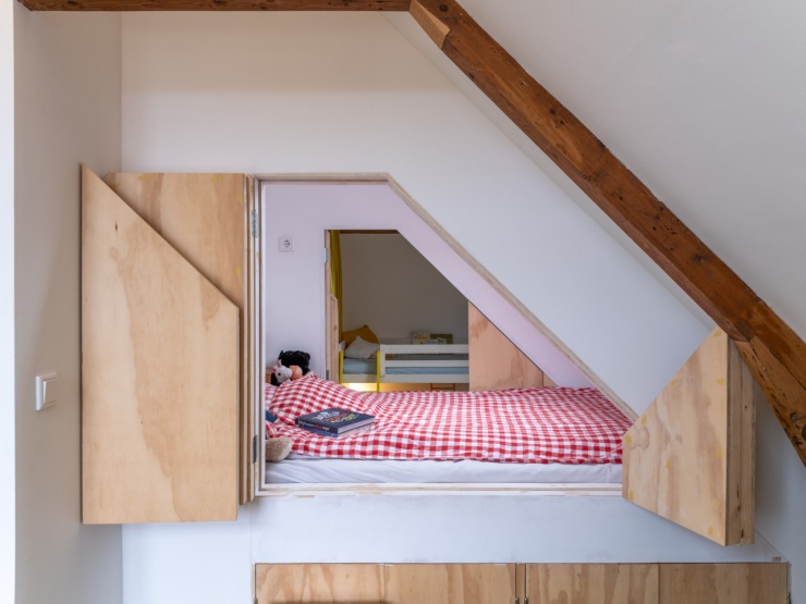 Im Obergeschoss, im dritten Stock, wurde der ursprüngliche Grundriss neu gestaltet. Was einst ein einziges großes Schlafzimmer mit offenem Bad war – nur durch eine halbhohe Wand getrennt –, wurde in eine klarer gegliederte Familienanordnung umgewandelt, die die Kinderzimmer und Schlafplätze umfasst. Da Elemente der Vergangenheit die Renovierungen der Gegenwart unterstützen, schafft dieses Gebäude eine perfekte Mischung aus Vertrautheit und Modernität in einem Zuhause.