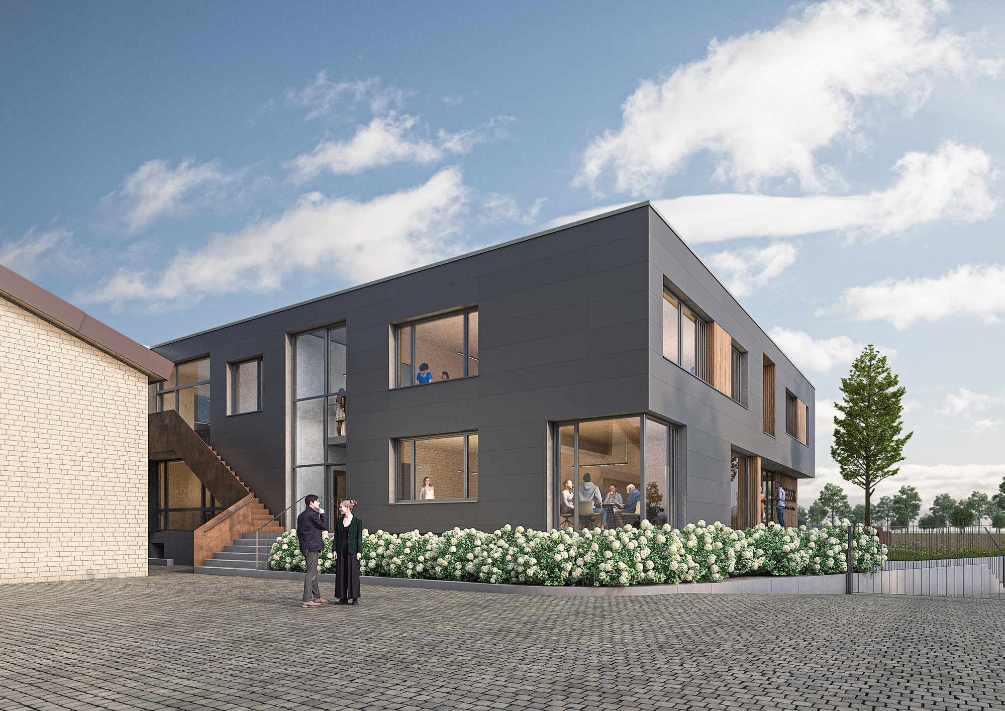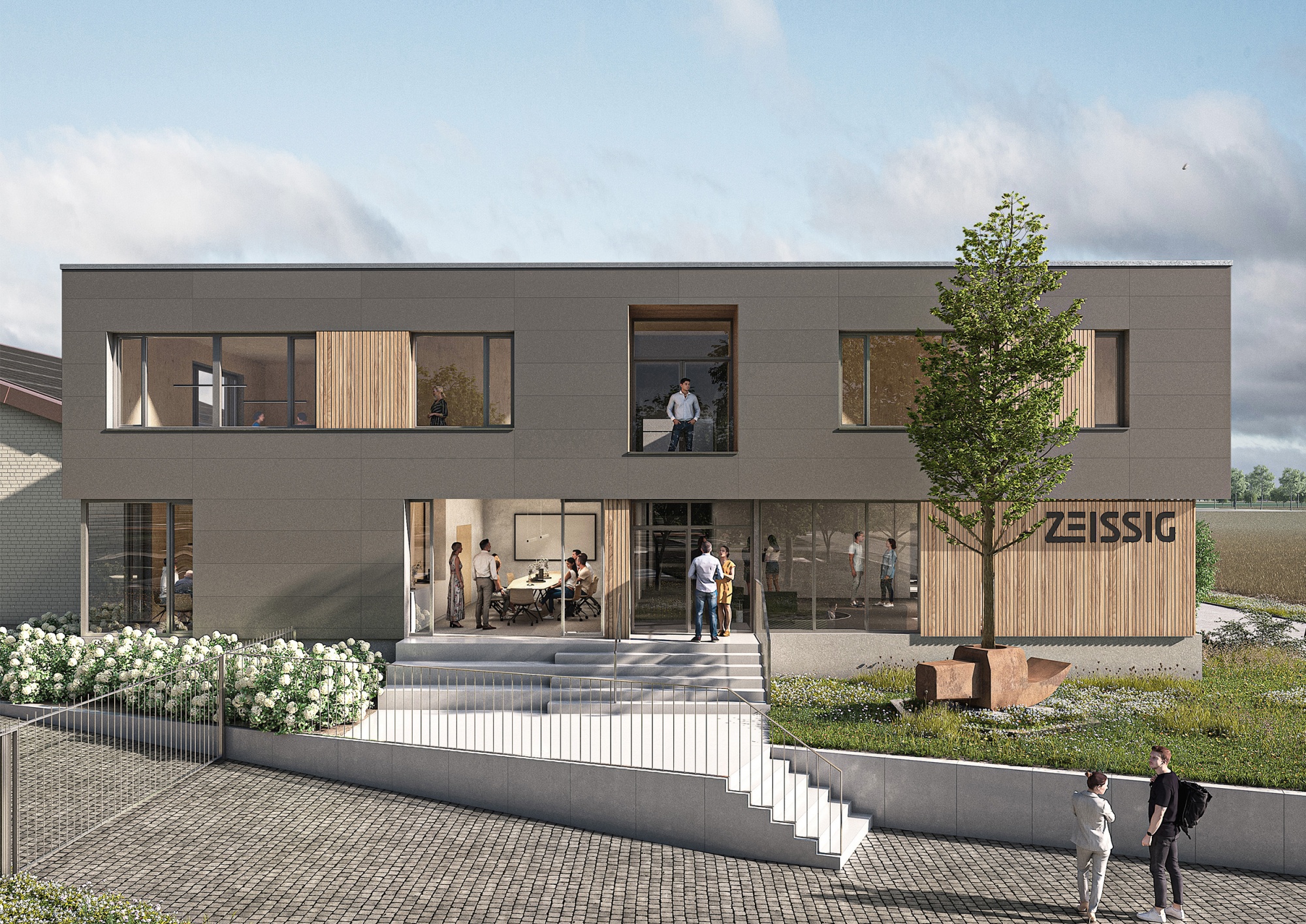 Ziel der Baumaßnahme ist es, den Außenauftritt der Firma Zeissig zu erneuern, eine Flächenerweiterung zu schaffen und den Bestand zugleich übersichtlicher zu strukturieren. Zudem ist eine energetische Modernisierung des Bestandsgebäudes geplant. Der eingeschossige Glasanbau im Norden und Westen des Bestandsgebäudes soll im Zuge der geplanten Baumaßnahme aufgrund energetischer und nutzungstechnischer Anforderungen zurückgebaut werden. An gleicher Stelle ist ein zweigeschossiger Erweiterungsbau in Holzbauweise geplant, um zusätzliche Bürofläche und eine effizientere Flächenausnutzung zu schaffen. Bestand und Erweiterungsbau sollen eine gemeinsame vorgehängte, hinterlüftete Fassade erhalten.Ein Schwerpunkt der Gestaltung liegt in der Adressbildung des Bürogebäudes in Richtung Westen. Um einen repräsentativen Eingangsbereich zu formulieren, erhält des Bürogebäude im Bereich des Erweiterungsbaus einen Unterschnitt. Vorgelagert befindet sich die bestehende Skulptur des „Eichenhammer" und wird so in das Eingangsensemble integriert.