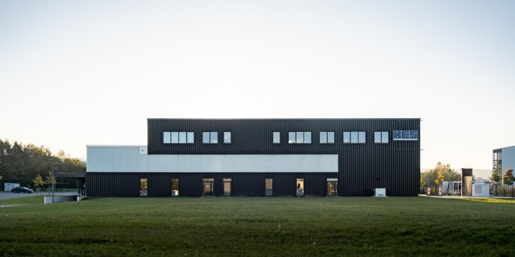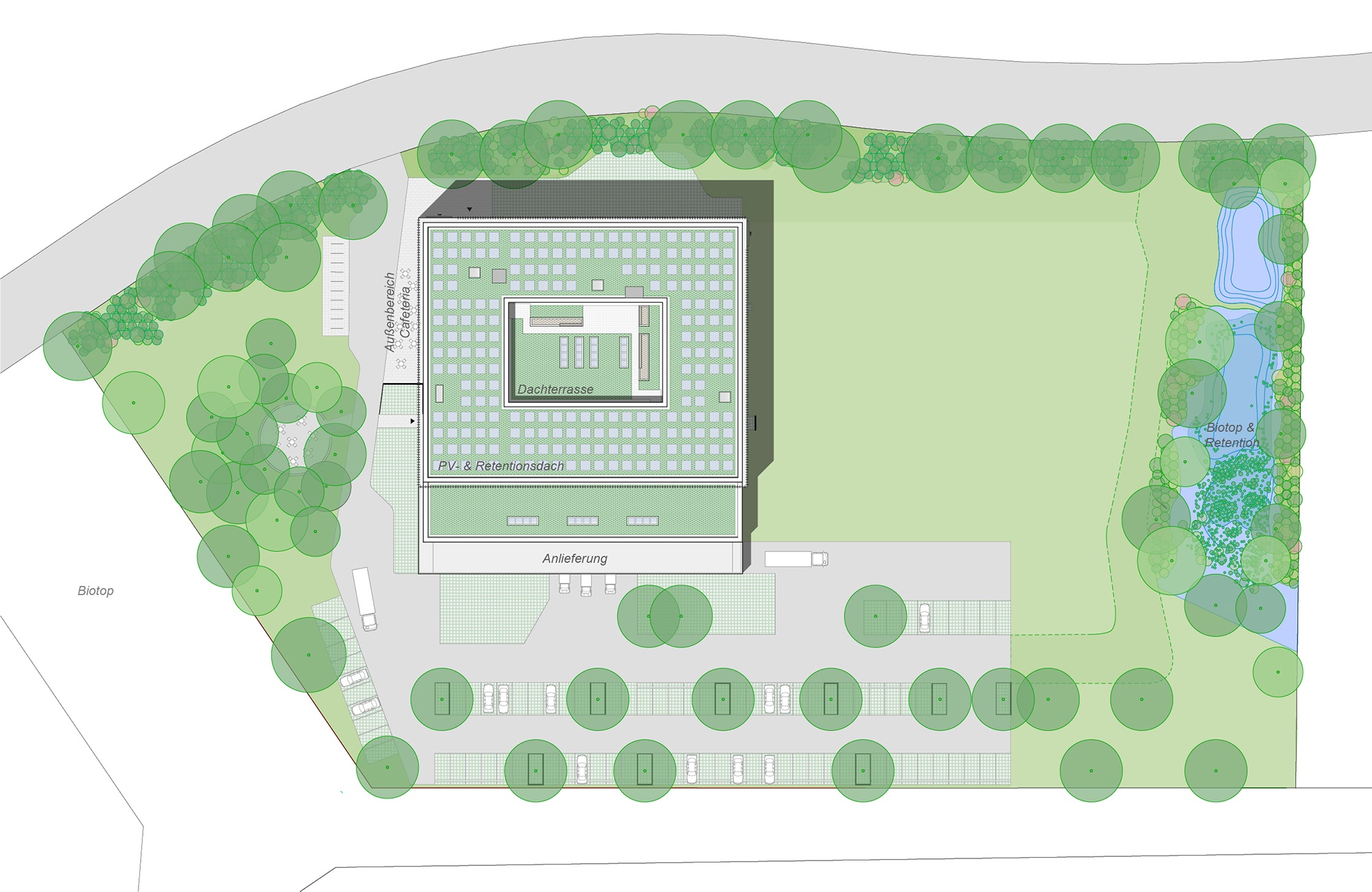 Die Skelettbauweise ermöglicht die Kombination von grossen offenen Produktionsbereichen, sowie flexible Bürogrundrisse. Ein umfassendes Klima- und Energiekonzept im KFW 55 Standard sieht einen Erdwärmetauscher unter dem Gebäude sowie Photovoltaik in Kombination mit einem Retentionsdach mit anschliessender Zisterne und Teich vor.