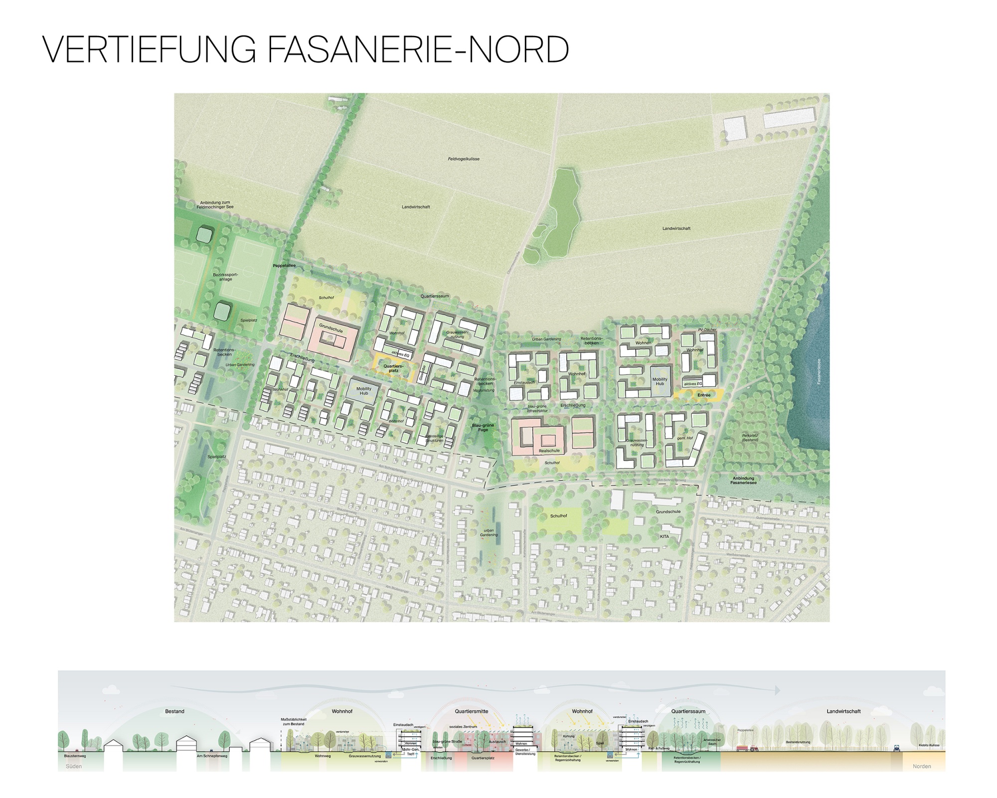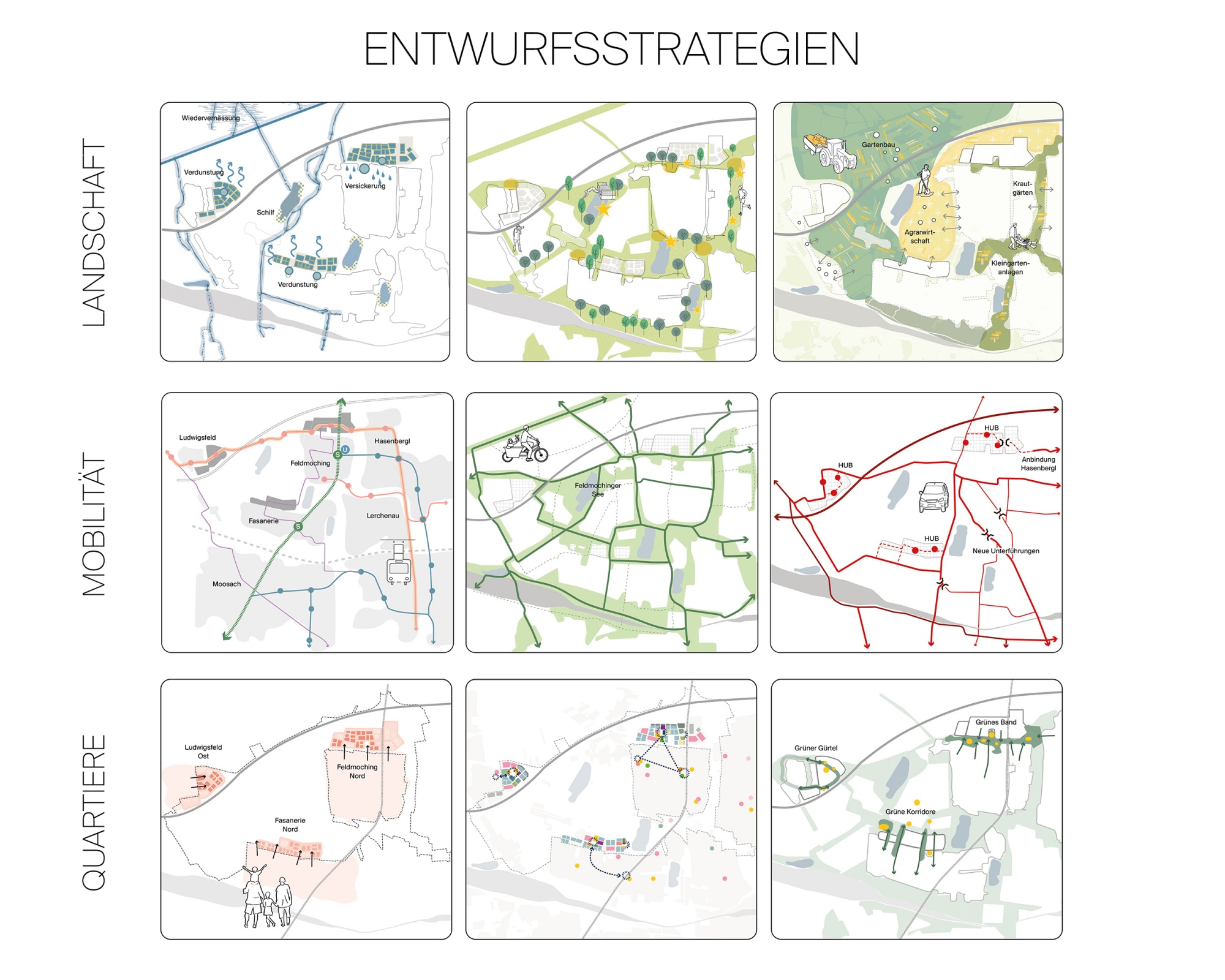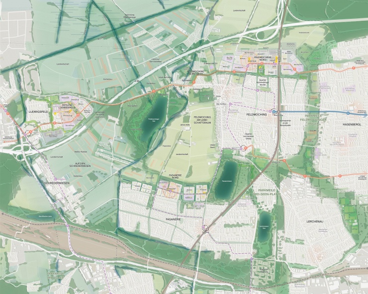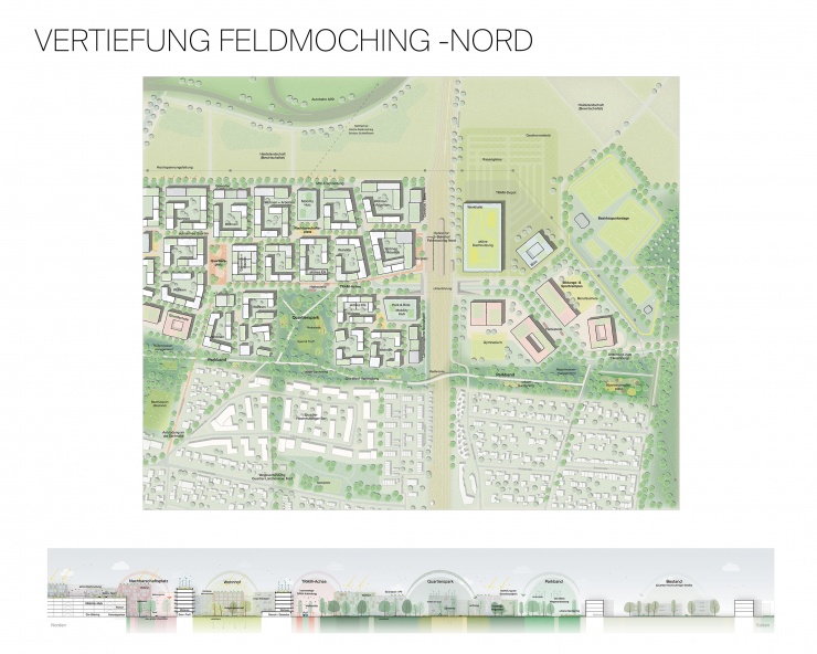 Das Konzept identifiziert drei Potenzialflächen für eine behutsame Siedlungserweiterung: zwei urbane Quartiere im Anschluss an Feldmoching und Ludwigsfeld sowie ein landschaftlich geprägtes Quartier nördlich der Fasanerie. Feldmoching-Nord/West, das Obermoos und die Schrederwiesen bleiben aufgrund ihrer landschaftlichen Wertigkeit unbebaut. Die neuen Quartiere knüpfen sensibel an den Bestand an, Freiräume fungieren als verbindende Räume. Bausteine der Nahversorgung sowie neue soziale und bildungsbezogene Einrichtungen ergänzen bislang unzureichend ausgestattete Bereiche.
