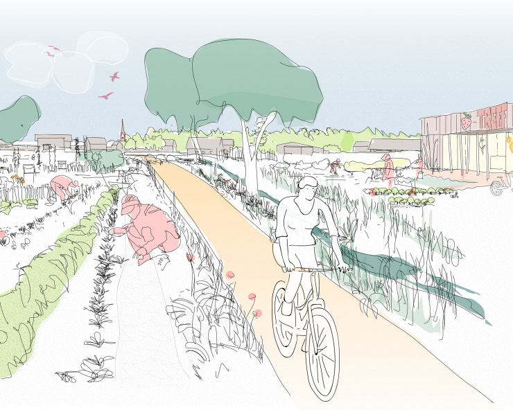 Ein breites Wohnungsangebot mit vielfältigen Typologien stärkt den sozialen Mix und schafft Perspektiven auch für die heutige Bewohnerschaft. Das Mobilitätskonzept entlastet die Bestandsquartiere durch die Priorisierung des Umweltverbundes aus Tram, Bus, Rad und Fuß. Die „Landschaftstram" verknüpft Quartiere und Freizeitziele mit dem überregionalen ÖV-Netz. In kompakten Quartieren sichern Angebote wie Carsharing, Bikesharing und Micro-Carrier Wahlfreiheit.