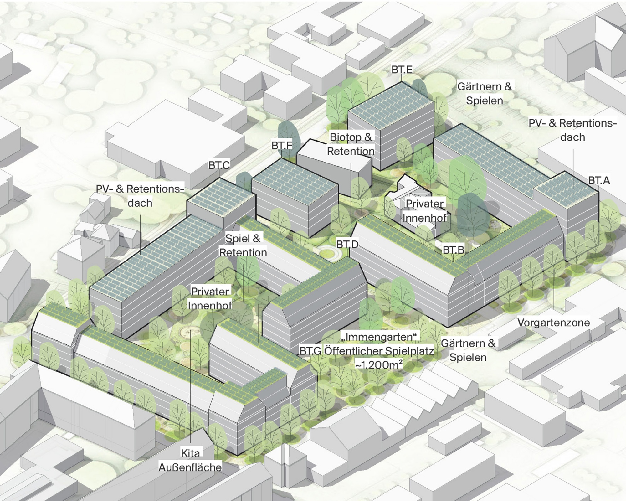 Das Freiraumkonzept setzt auf klimaresiliente Gestaltung, vielfältige Vegetation, klare Aufenthaltsorte und die Option einer Schwammstadt. Blühflächen, Retentionsräume und begrünte Fassaden fördern Biodiversität und ein angenehmes Mikroklima.