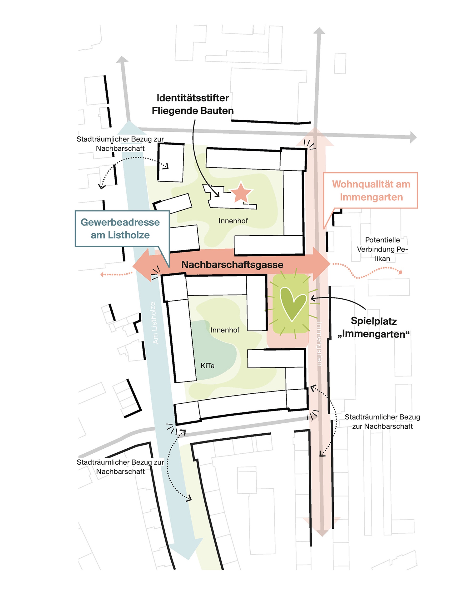 Im Zentrum liegt ein großzügiger öffentlicher Spielplatz, der als Herz des Quartiers funktioniert und von lebendigen Erdgeschosszonen gefasst wird. Eine durchgängige Ost-West-Verbindung stärkt die Verknüpfung zu den umliegenden Grünzügen und schafft neue Adressen im Quartiersinneren. Die Hofstrukturen orientieren sich an den typischen Listhöfen und bilden geschützte Freiräume für Wohnen, Kita und gemeinschaftliche Nutzung.