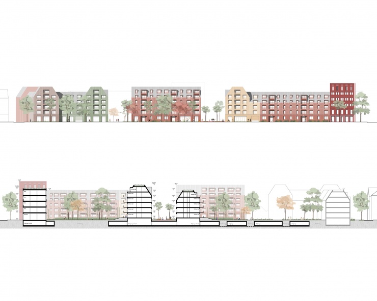 Die Gebäude greifen Motive der Umgebung auf: Büro- und Gewerberiegel mit markanten Sockelzonen sowie farblich differenzierte Wohngebäude mit Gauben, Loggien und Mansarddächern. Flexible Grundrisse ermöglichen langfristige Anpassbarkeit. Eine Tiefgarage, Fahrrad-HUBs und kurze Wege fördern einen autofreien Lebensstil. So entsteht ein lebendiger Stadtbaustein, der Offenheit, Vielfalt und hohe Freiraumqualität zu einem klaren, robusten Quartier bündelt.