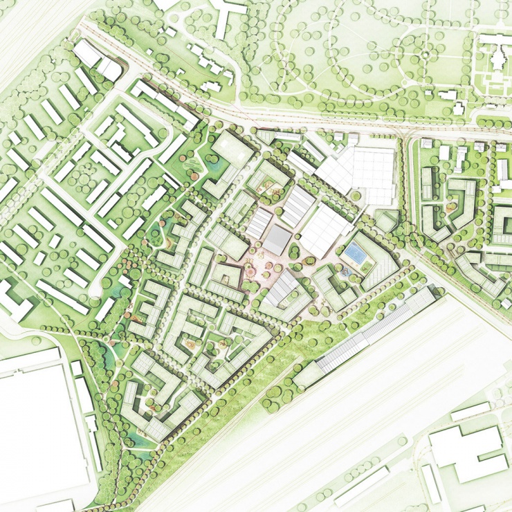 Ausgangspunkt des städtebaulichen Konzepts ist das Knüpfen zweier starker Freiraumverbindungen, die als grüne Klammer das neue Quartier auf vielfältige Weise in den städtebaulichen Kontext einbetten und mit diesem verweben. Überörtlich verknüpft die grüne Klammer die sehr unterschiedlichen und bislang voneinander separierten urbanen Freiräume Gleisharfe und Hauptfriedhof. Die beiden Freiraumsequenzen strukturieren die den bislang ungeordneten Stadtraum und geben der Quartierentwicklung eine klare Kontur.