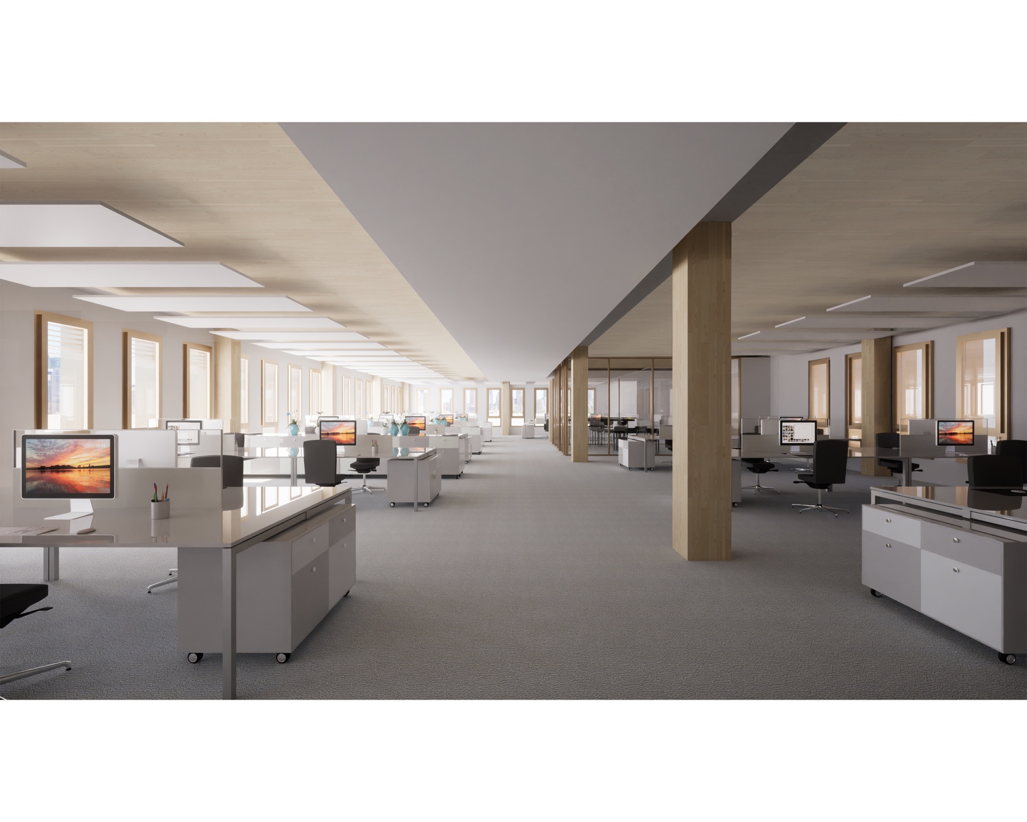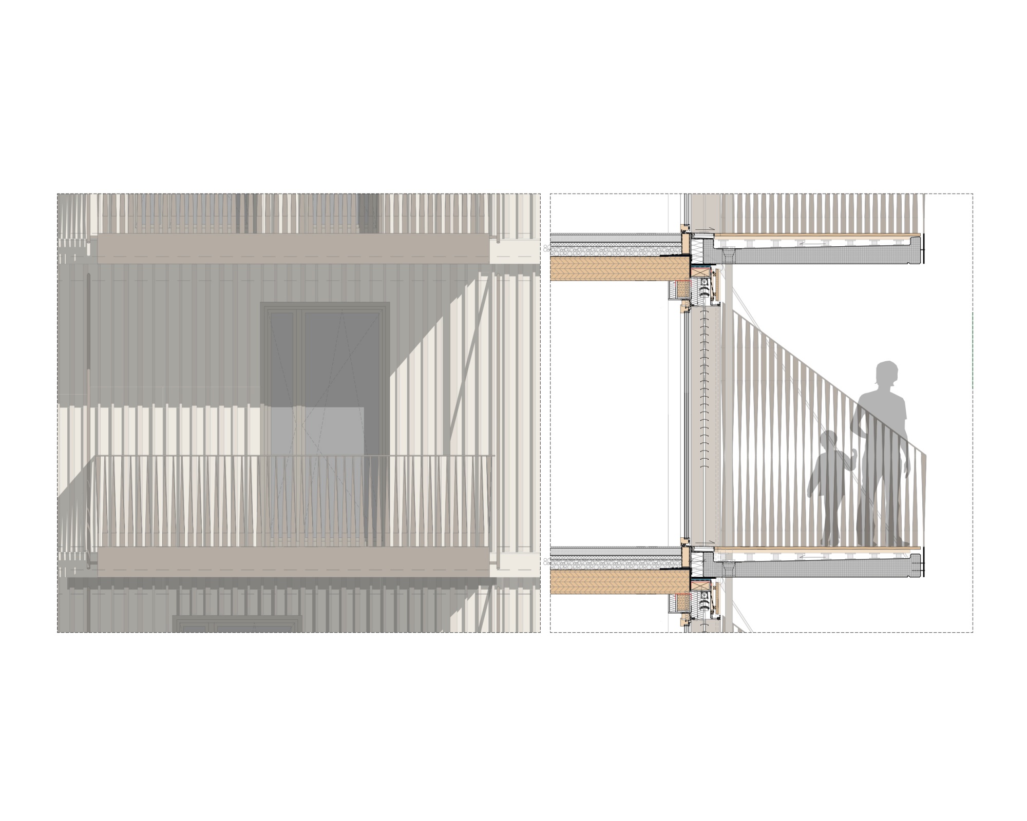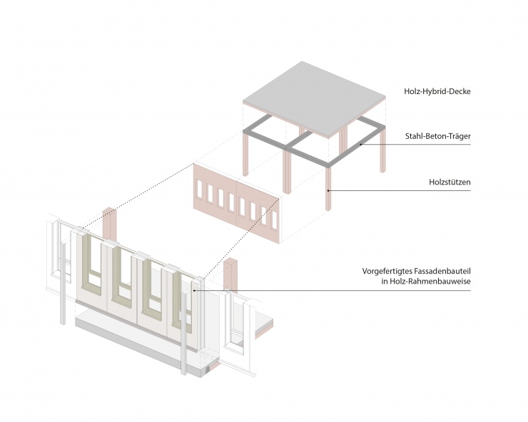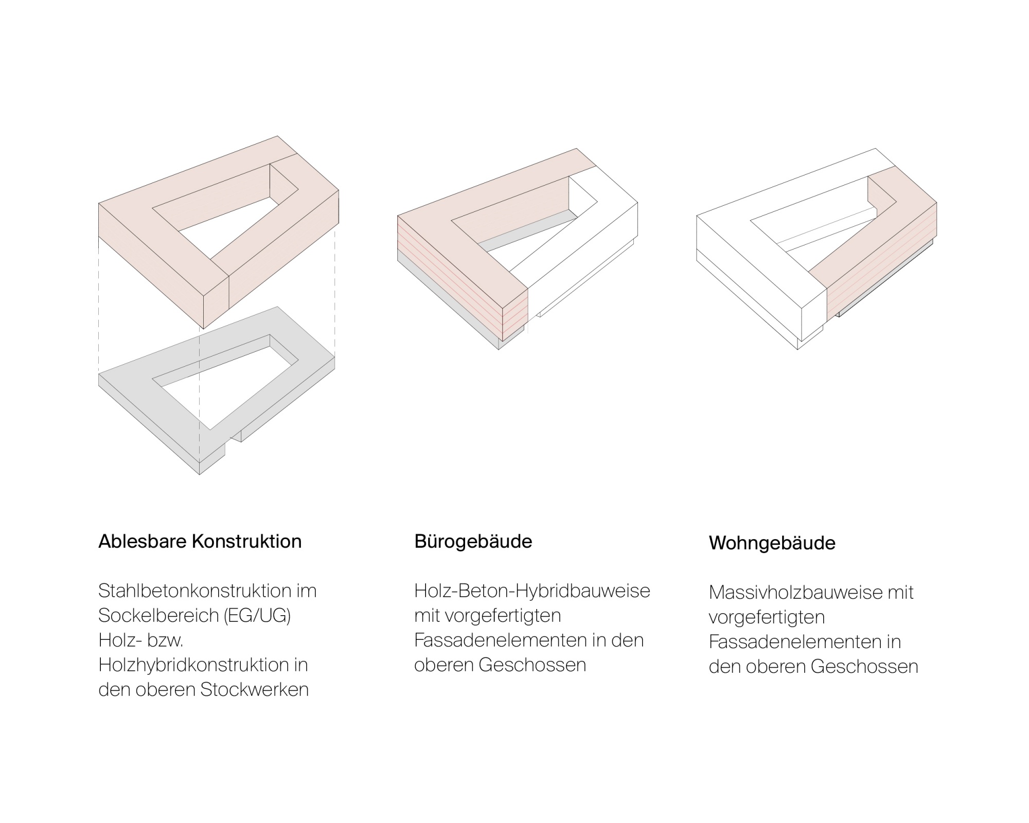 Das Gebäude wird als Holzhybridbau mit Holzfassade und klar gegliedertem Sockelgeschoss umgesetzt. Büro- und Wohnbereiche unterscheiden sich in ihrer Fassadengestaltung, bleiben jedoch gestalterisch Teil eines gemeinsamen Ensembles.