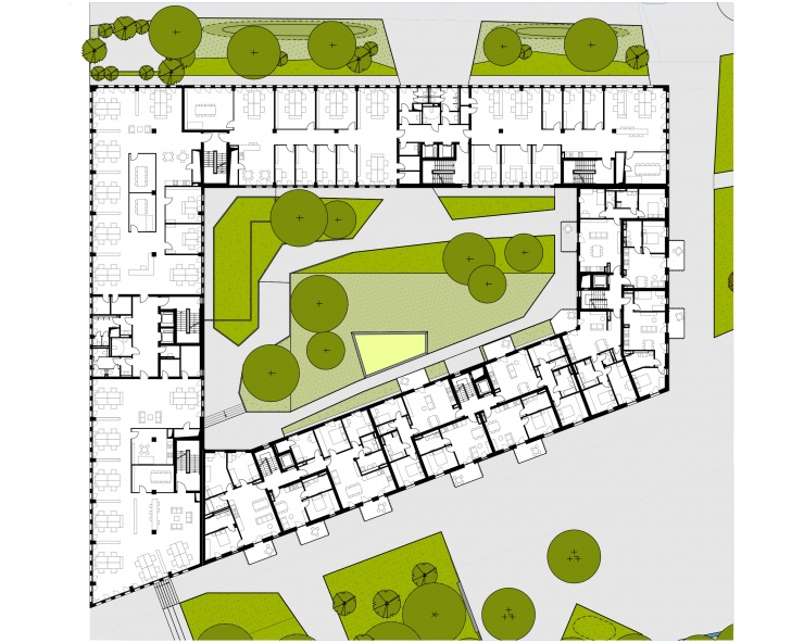 Der Entwurf verfolgt das Ziel, Wohnen, Arbeiten und Gewerbe in einem Gebäude zu verbinden und damit soziale Vielfalt sowie eine lebendige Quartiersstruktur zu fördern. Vorgesehen sind Büroflächen, Eigentumswohnungen und Gewerbeeinheiten mit Gastronomie und Einzelhandel. Städtebaulich wird ein kompakter Blockrand mit Innenhof ausgebildet, der sich zum Quartiersplatz öffnet und zugleich halbprivate Freiräume für Bewohner:innen und Nutzer:innen bietet.