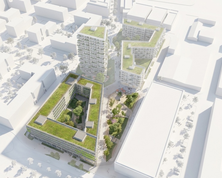Neben einer Tiefgarage mit Stellplätzen und Fahrradabstellräumen sind begrünte Retentionsdächer, Photovoltaik und eine Wärmeversorgung über Geothermie vorgesehen. Ziel ist ein nachhaltiges Gebäude mit DGNB-Gold-Zertifizierung, Effizienzhaus-40-Standard und hoher Aufenthaltsqualität im Zusammenspiel von Architektur, Freiraum und Nutzungsmischung.